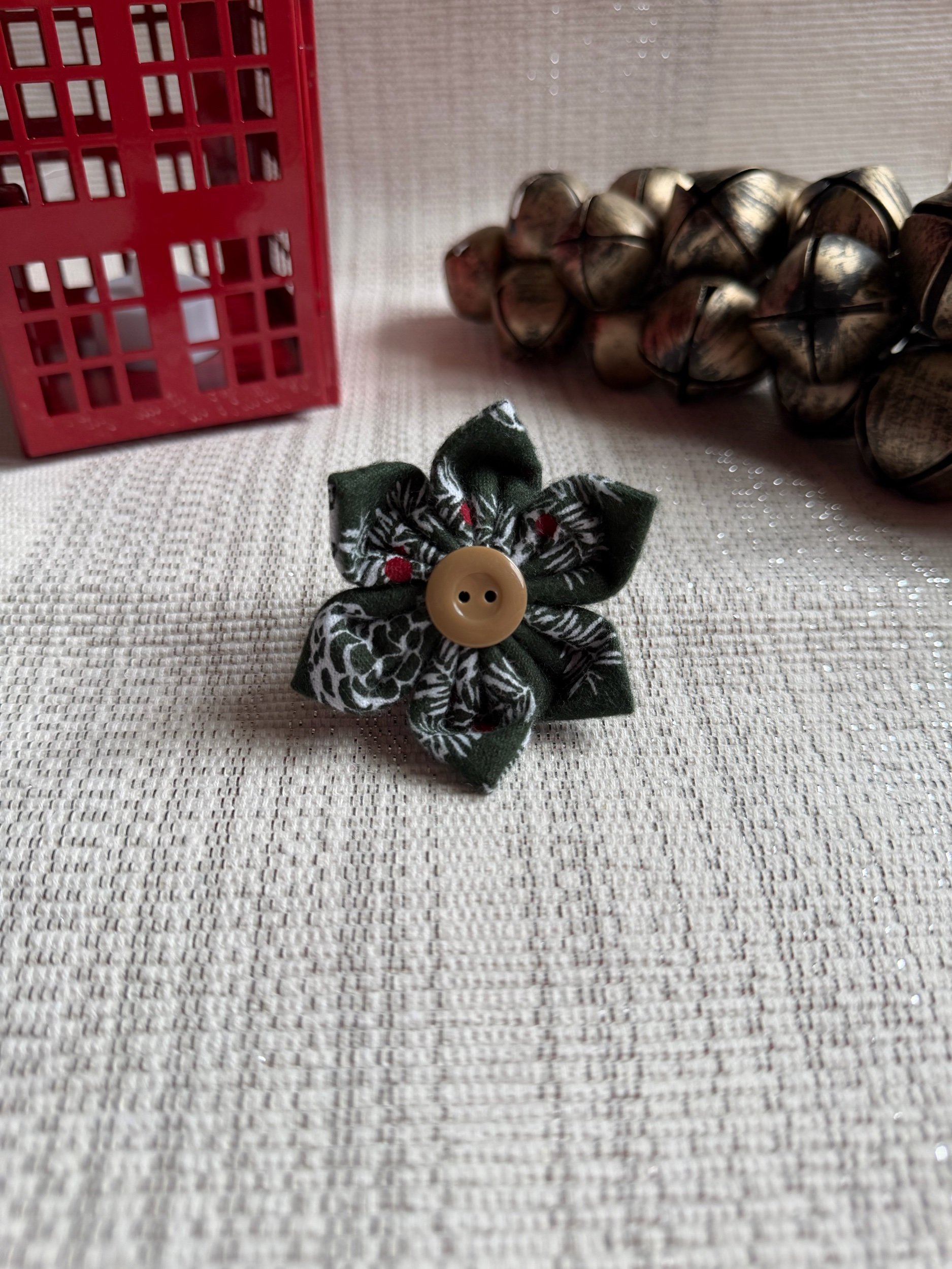 Image 1 of 1 Holly Flower $5.00 This flower Velcros around pets collar. Will fit around up to a 2 inch collar. The flower itself is 3 inches wide. Add To Cart Added! This flower Velcros around pets collar. Will fit around up to a 2 inch collar. The flower itself is 3 inches wide.