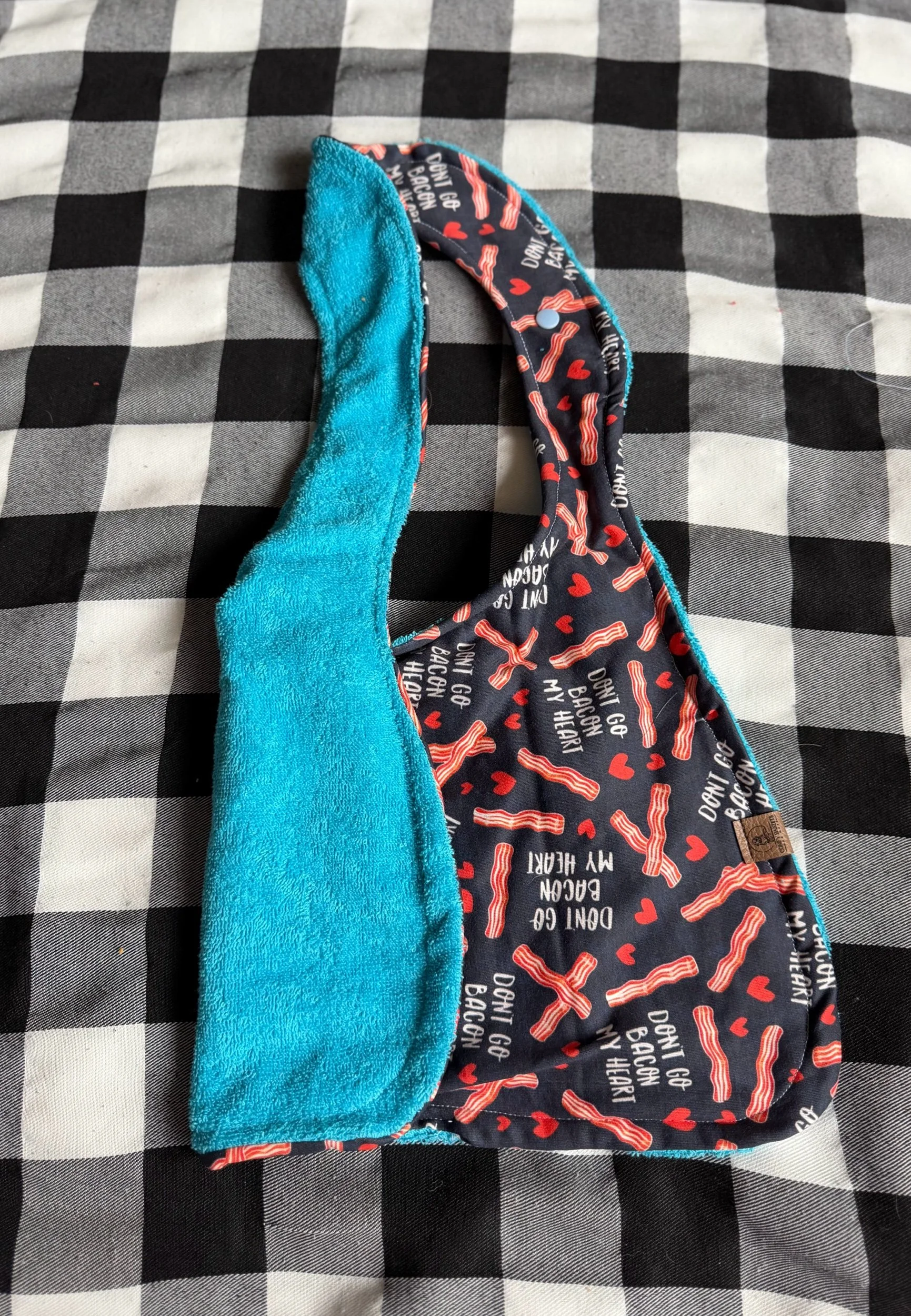 This drool bib is absorbent with one side of terry cloth and the other side of flannel fabric. The neck fits up to an approx. 33 inch neck.
