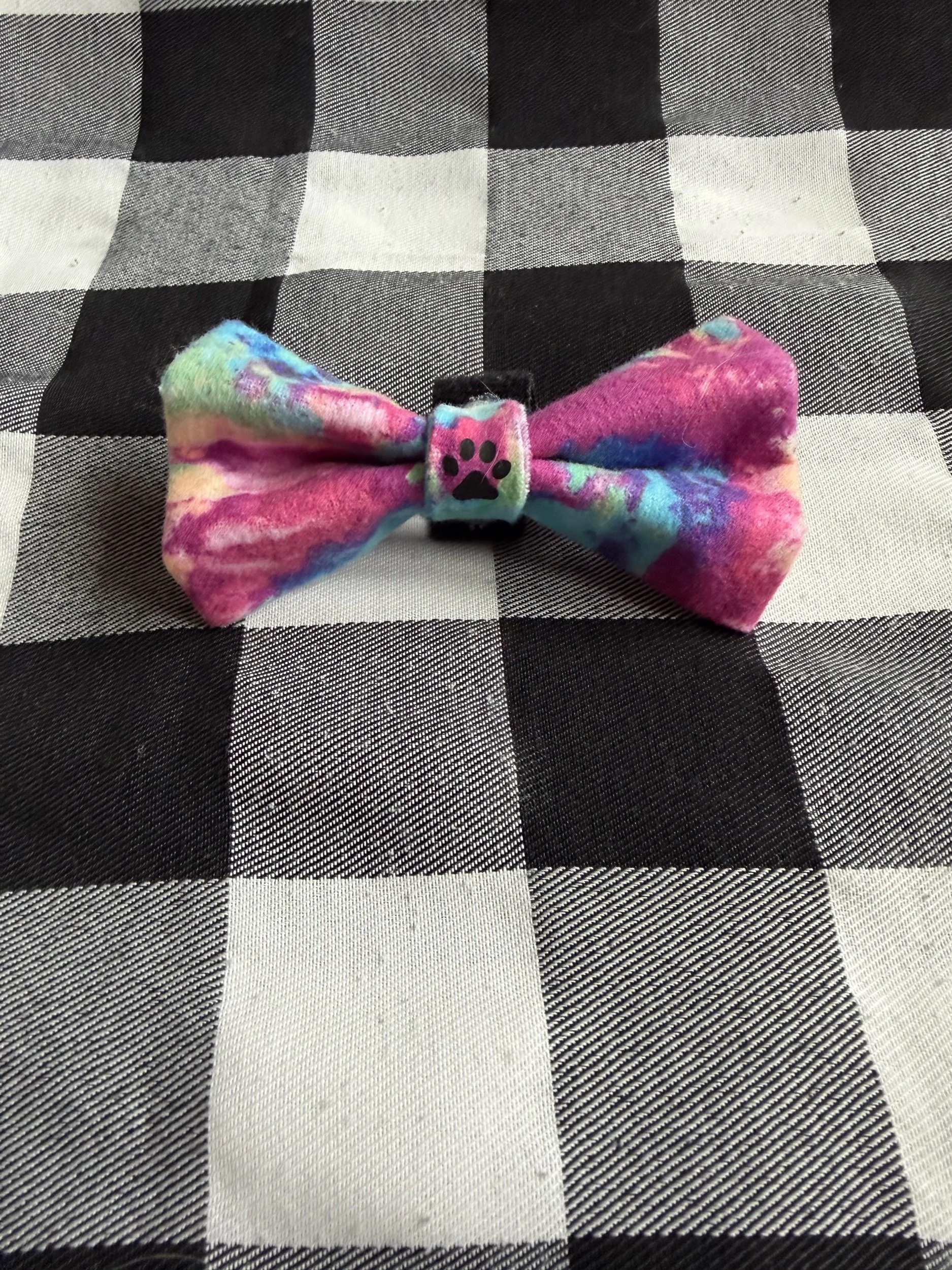 This bow tie Velcros around pets collar. Fits approx. 2 inch wide collar. This bow tie comes in size large which is approx. 5 inches wide.