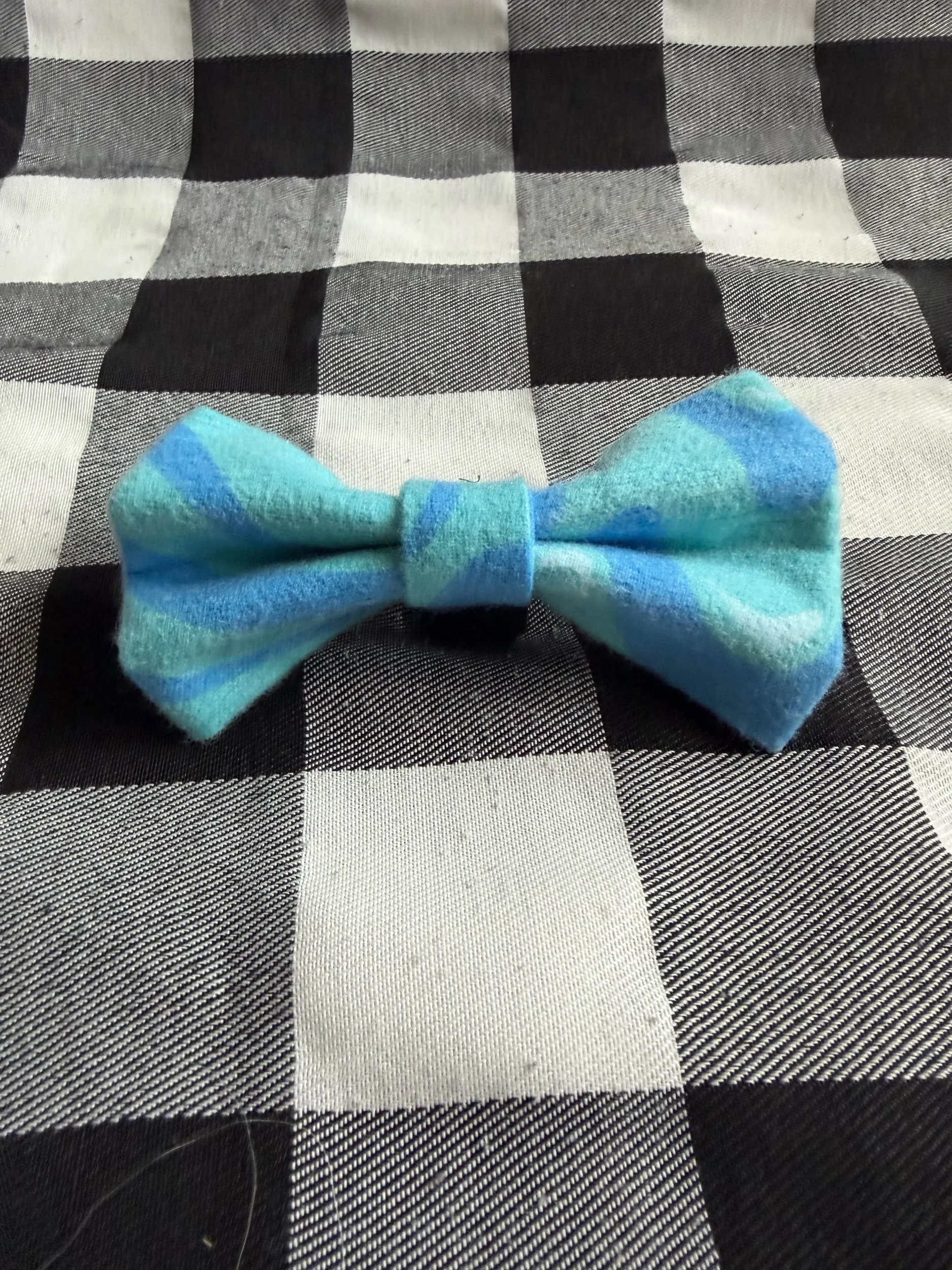 This bow tie Velcros around pets collar. Fits approx. 2 inch wide collar. This bow tie comes in size large which is approx. 5 inches wide.